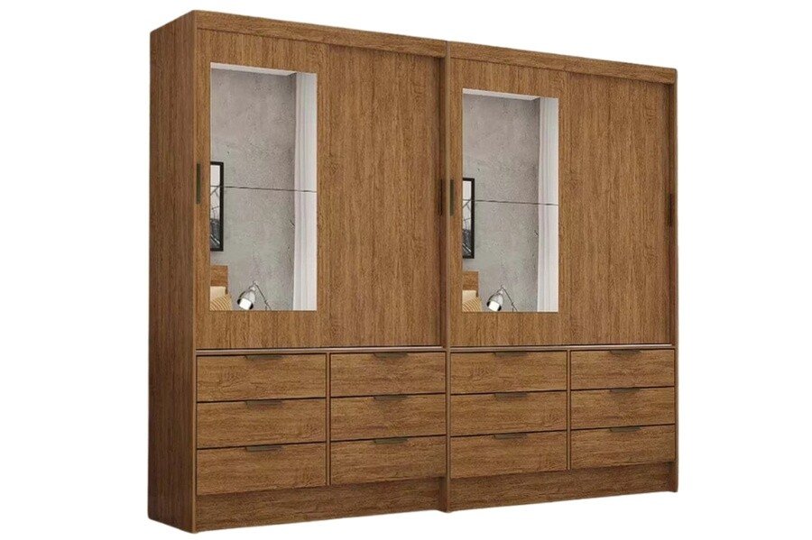 3{%%}Descrição{%%}2 Roupeiros Sevilha Cinamomo 4 Portas C/ 2 Espelho 12 Gavetas – Carioca