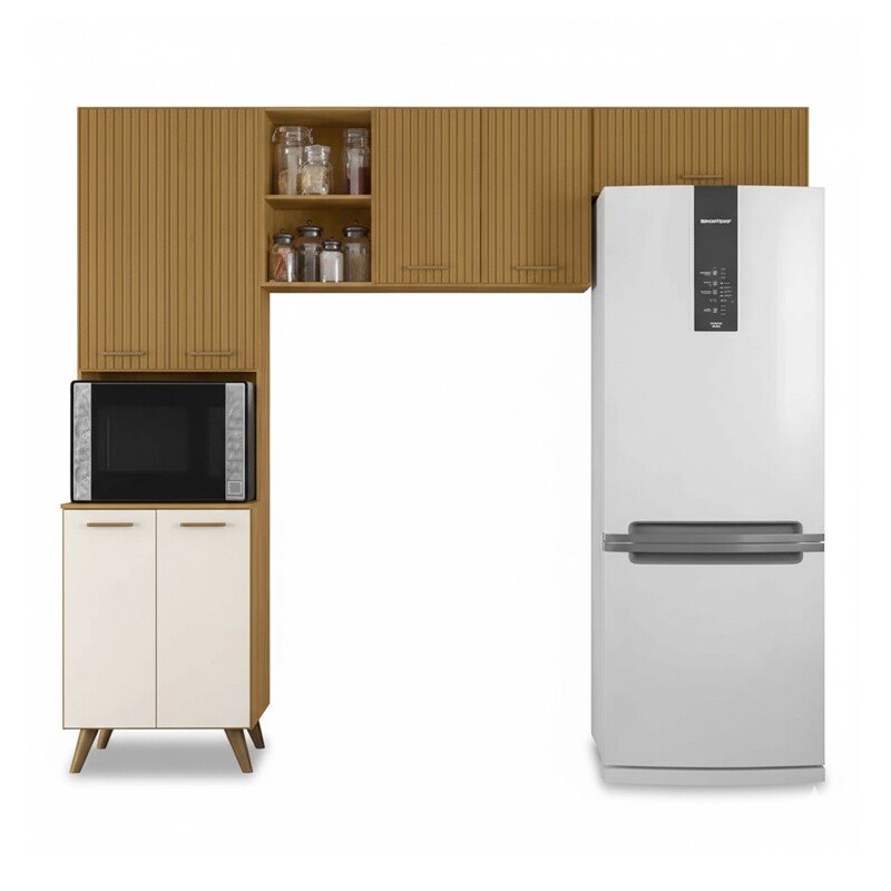 3{%%}Descrição{%%}Armário Cozinha Olinda Freijó/Off Paneleiro + Aéreo 1.05m + Aéreo de Geladeira Ripado 3D – Poliman