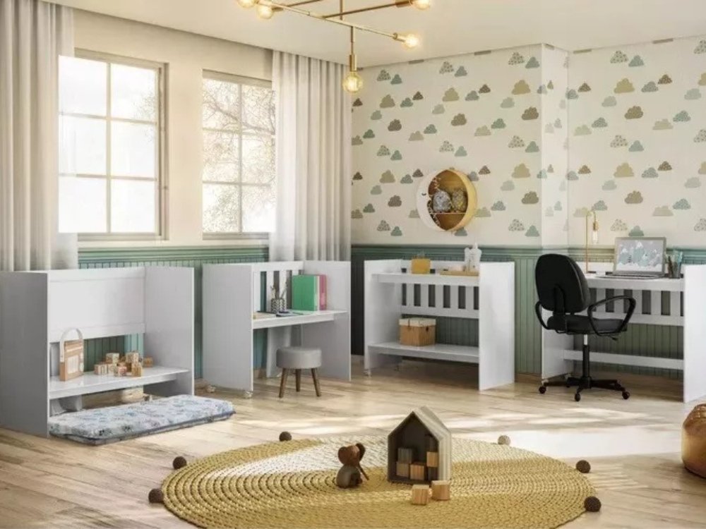 Berço padrão americano 100% Bordas laqueadas 5 Fases: Miniberço, Mesa de recreação, Mesa de estudos, Aparador e Escrivaninha. Acompanha Colchão Berço Certificado conforme portaria INMETRO nº 143/2021 Registro nº 008091/2021 OCP 0070