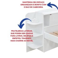 – Prateleira laterais que podem ser usadas para colocar livros, objetos e enfeites. Além disso pode ser montada em ambos os lados da cabeceira.