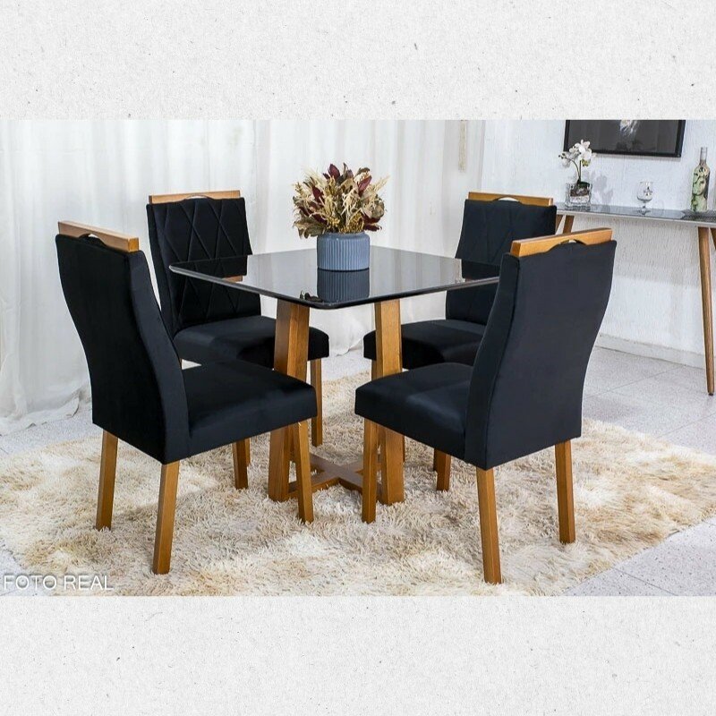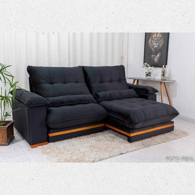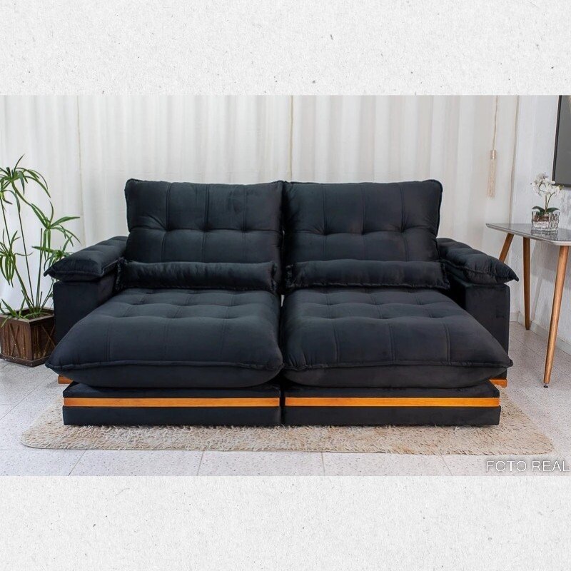 3{%%}Descrição{%%}Sofá Retrátil Ibis 2.30m Veludo Preto 820 + Mesa Pedro Mel Tampo Vidro Preto 90×90 4 Cad. Lisboa Veludo Preto 504