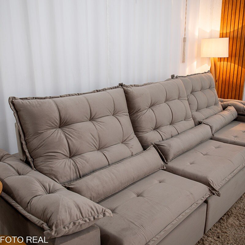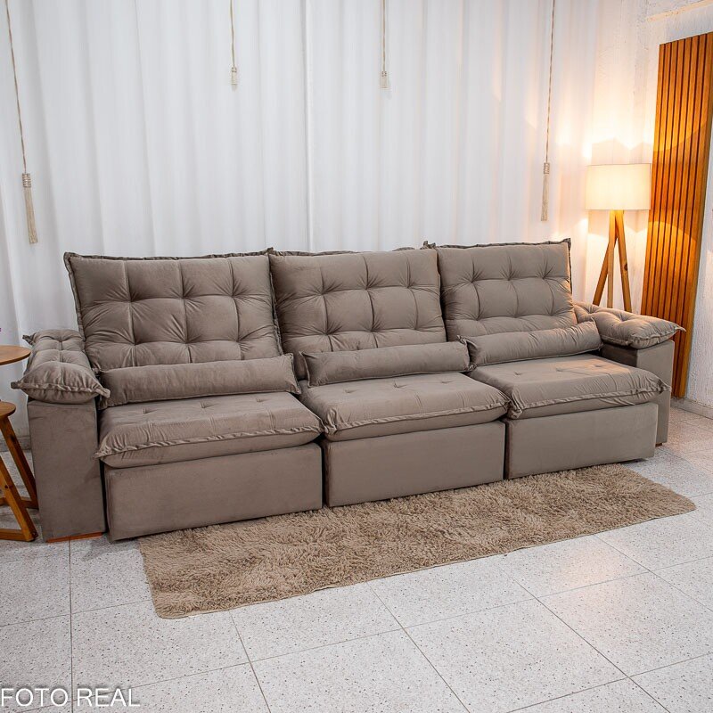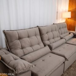 3{%%}Descrição{%%}Sofá Retrátil Reclinável Emanuelly 3.20m Veludo Capuccino 02 – D28 Soft