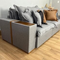 Braço com 25cm de largura, detalhes em couro e tampo de madeira no braço.