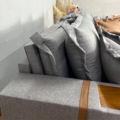 Todo revestido em linho, com detalhes em couro.
