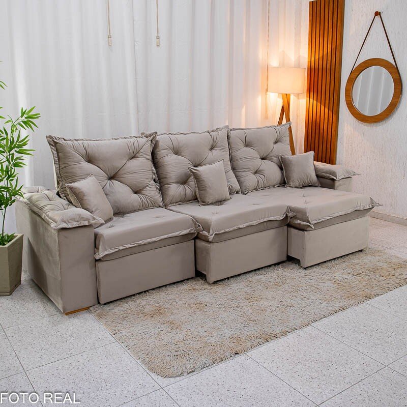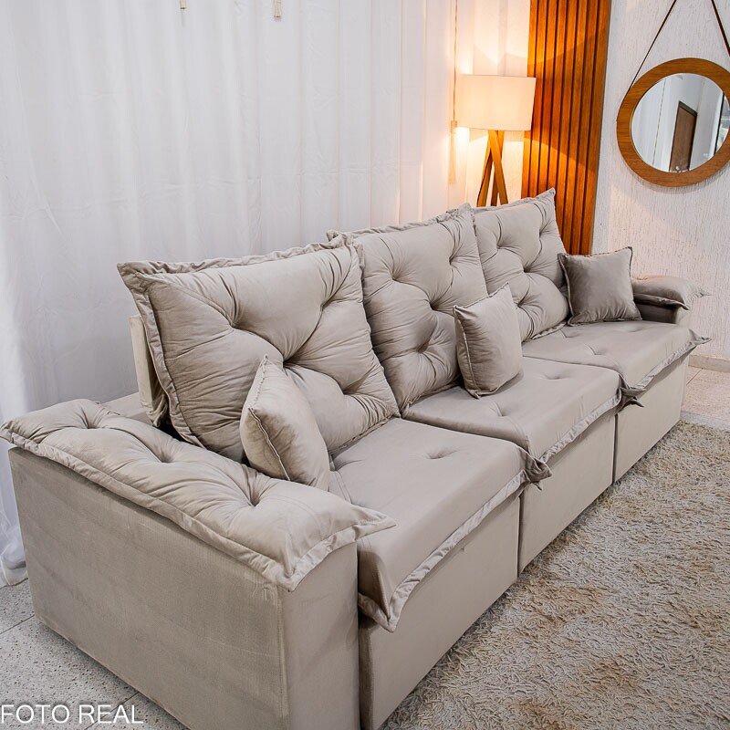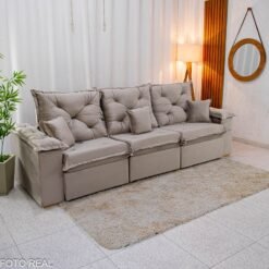 No assento, o conforto é garantido pela espuma D28 Pró Aditivada com 18cm de espessura, sustentação em percintas elásticas e corrediças de ferro com sistema de freio. O encosto é reclinável, com várias posições, e vem com duas almofadas decorativas de brinde, além do braço com pillow top macio, ideal para apoiar os braços ou até deitar.