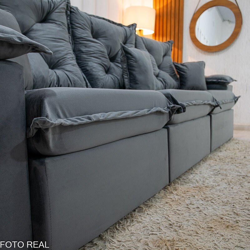 No assento, o conforto é garantido pela espuma D28 Pró Aditivada com 18cm de espessura, sustentação em percintas elásticas e corrediças de ferro com sistema de freio. O encosto é reclinável, com várias posições, e vem com duas almofadas decorativas de brinde, além do braço com pillow top macio, ideal para apoiar os braços ou até deitar.