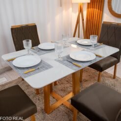 Mesa de Jantar Pedro 120×80 Mel Vidro Off + 4 Cad. Genova Veludo Marrom 509 Madeira Art Assento – Entregue Montada