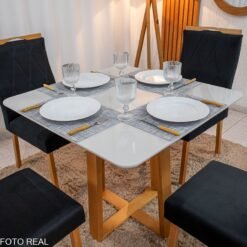 Mesa de Jantar Pedro 90×90 Vidro Off/Base Madeira + 4 Cad. Lisboa Veludo Preto 504 Madeira Art Assento – Entregue Montada