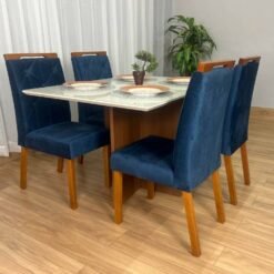 Mesa de Jantar Helo 1.20×0.90 Com 4 Cadeiras Jasmim – Mel/Off White/Azul Veludo